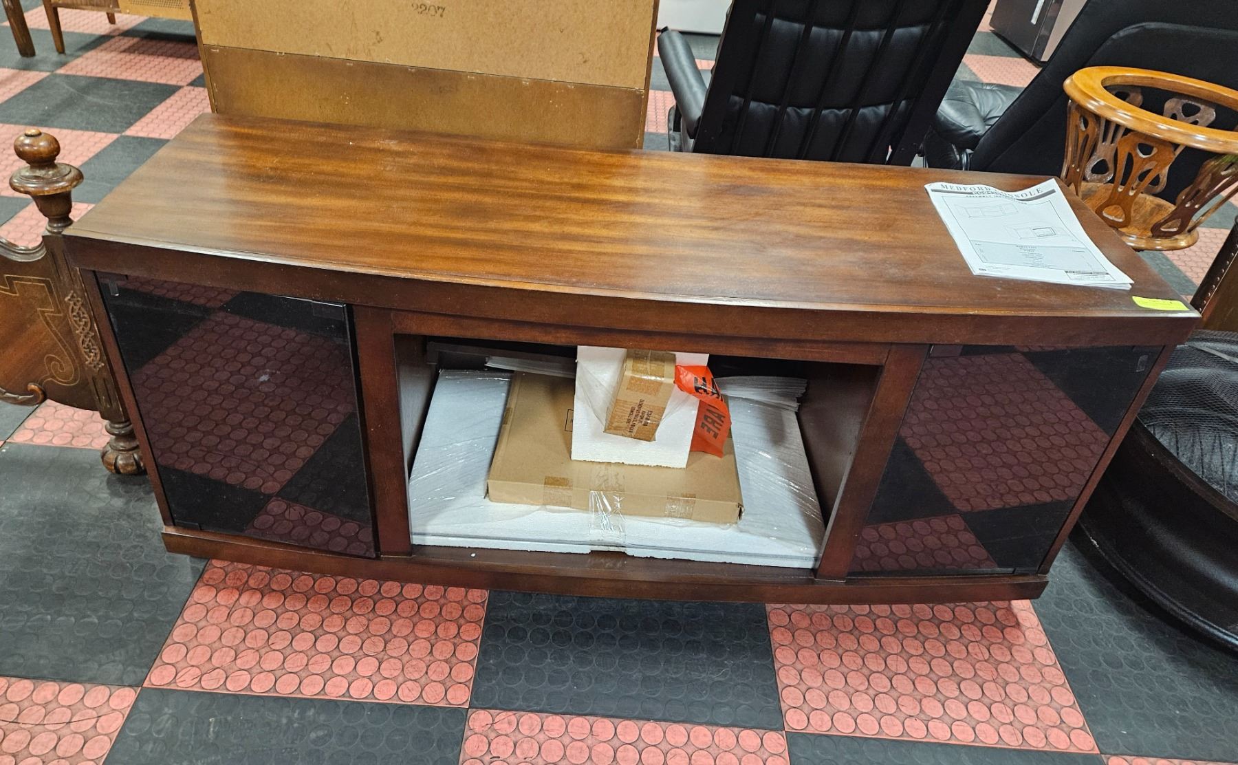 BROWN, WOOD GRAIN, SOLID BUILD, TEMPERED GLASS, SHELVES, APPROXIMATELY 58 X 19.5 X 26", AMZ SES **ALL ITEMS MUST BE REMOVED BY 5PM SATURDAY, JUNE 8TH 2024. ALL REMAINING ITEMS WILL BE SUBJECT TO A $6.00 PER DAY STORAGE CHARGE. ANY ITEMS REMAINING AFTER MONDAY, JUNE 24TH 2024 WILL BE CONSIDERED FORFEITED. NO REFUNDS WILL BE ISSUED FOR FORFEITED ITEMS. TO SCHEDULE A PICK UP APPOINTMENT CLICK HERE