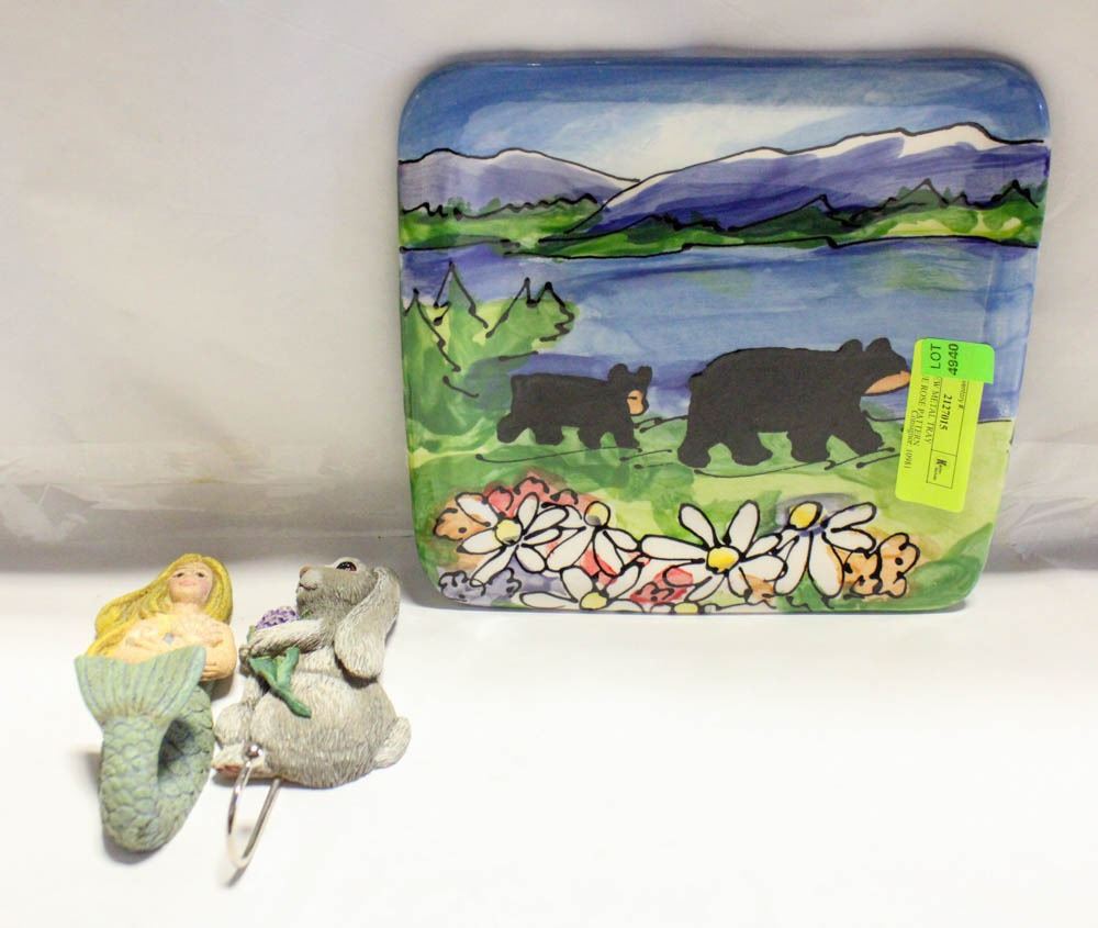 TAG ATTACHED. SIZE — 16 1/4” WIDTH, INCLUDING HANDLES, 9” LENGTH + HANDPAINTED PLATE SIGNED BY ARTIST ON BACK DESIGN OF TWO BLACK BEARS, MOM W/ CUB. PLATE IS ENTIRELY PAINTED, FRONT AND BACK. SIZE 8.5“ X 8 1/2“SQUARE + 2 DECORATIVE DISPLAY HOOKS 1 MERMAID HAND PAINTED/CRAFTED. 1 RABBIT, CRAFTED BY “CRUMPETS CORNER”
