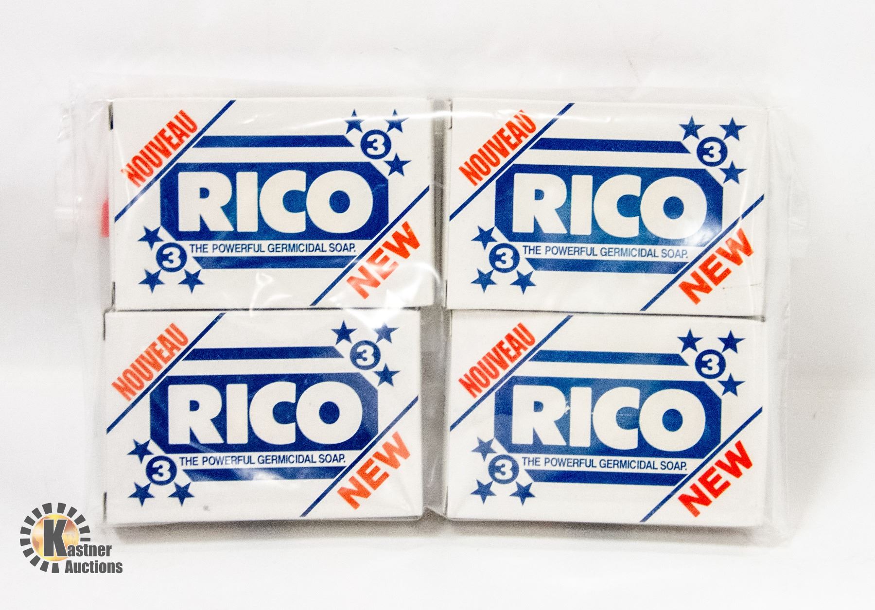 BRAND NEW, PACK OF 4 BARS, RICO GERMICIDAL SOAP GIVES A LUXURIOUS LATHER WHICH GENTLY AND THOROUGHLY CLEANSES THE SKIN. AMZ SES **ALL ITEMS MUST BE REMOVED BY 5PM SATURDAY, AUGUST 24th 2024. ALL REMAINING ITEMS WILL BE SUBJECT TO A $6.00 PER DAY STORAGE CHARGE. ANY ITEMS REMAINING AFTER MONDAY, SEPTEMBER 16TH 2024 WILL BE CONSIDERED FORFEITED. NO REFUNDS WILL BE ISSUED FOR FORFEITED ITEMS. TO SCHEDULE A PICK UP APPOINTMENT CLICK HERE