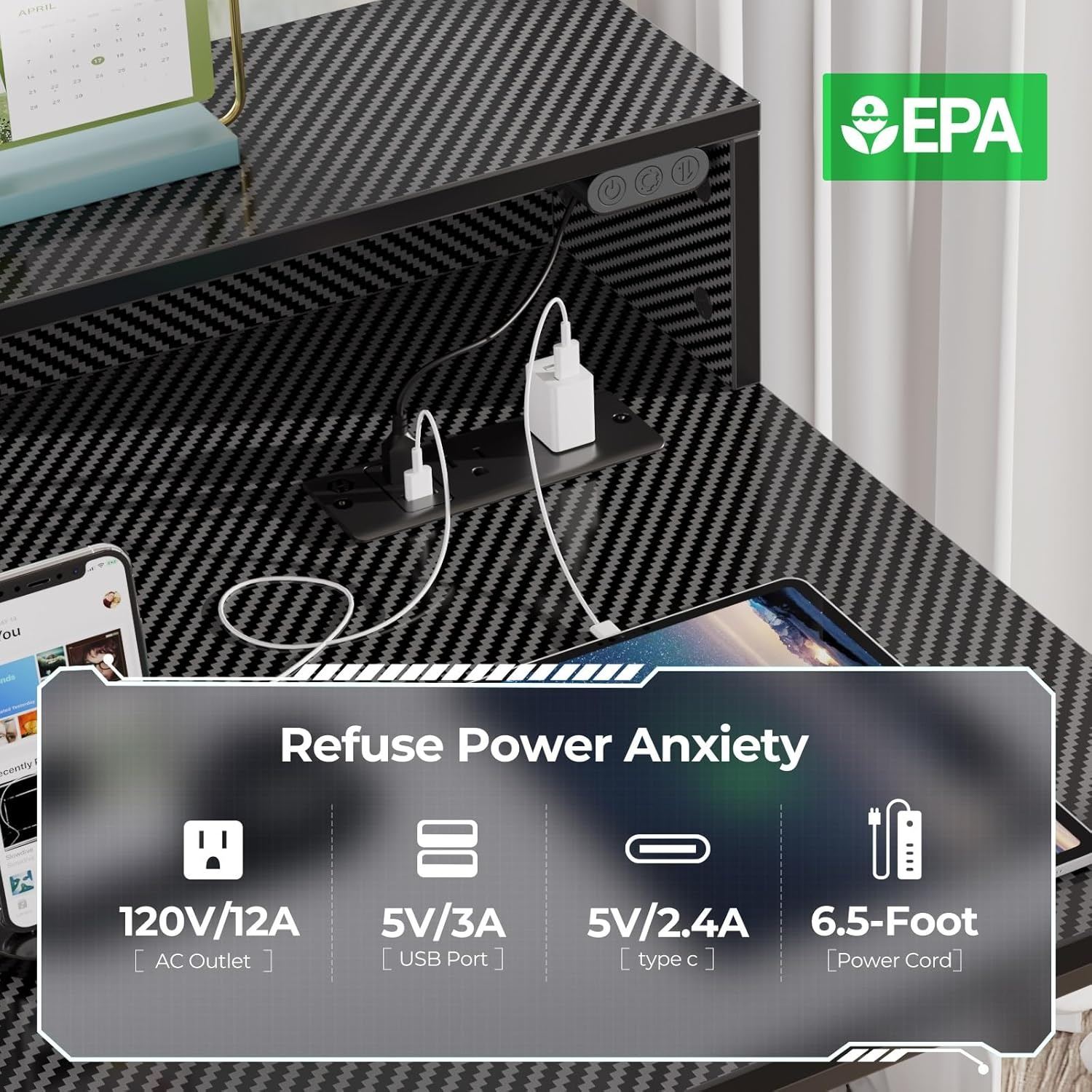 OUTLET AND LED LIGHTS, BLACK CARBON FIBER SURFACE, 2 STORAGE SHELVES, MEDIA HOOKS, TOWER SHELF, KEYBOARD TRAY, MONITOR STAND, H-34.5" W-19" L-54" AMZ SES **ALL ITEMS MUST BE REMOVED BY 5PM SATURDAY, MAY 31ST 2025. ALL REMAINING ITEMS WILL BE SUBJECT TO A $6.00 PER DAY STORAGE CHARGE. ANY ITEMS REMAINING AFTER MONDAY, JUNE 16TH 2025 WILL BE CONSIDERED FORFEITED. NO REFUNDS WILL BE ISSUED FOR FORFEITED ITEMS. TO SCHEDULE A PICK UP APPOINTMENT CLICK HERE