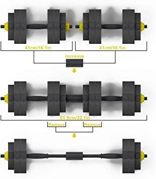 FREE WEIGHT SET WITH ADJUSTABLE CONNECTING BARS TO GO FROM DUMBBELLS TO BARBELL, CONTAINS 8 X 2.5KG WEIGHTS AND 4 X 1.25KG WEIGHTS, ALL PARTS ATTACHMENTS AND ACCESSORIES INCLUDED, IN ORIGINAL BOX, AMZ SES