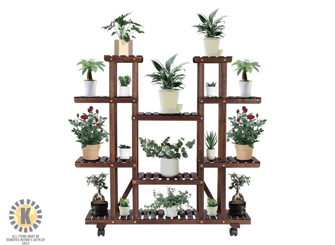 PLANT STAND WITH 17 SECTIONS FOR POTS, BROWN, ALL PARTS AND MANUAL CONFIRMED, IN ORIGINAL BOX, AMZ SES. ALL ITEMS MUST BE REMOVED WITHIN 5 DAYS OF SALE
