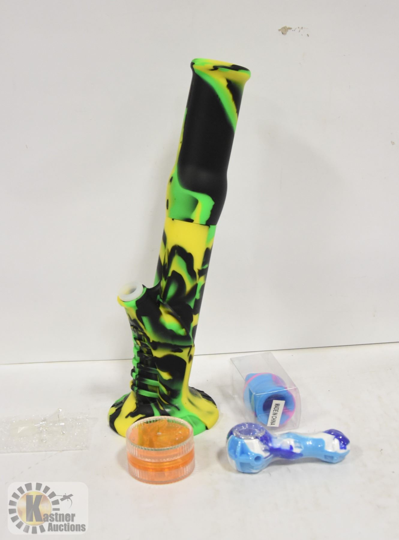 BRAND NEW SILICONE PIPE W/ GLASS INSERT + BRAND NEW SILICONE FILTER MOUTHPIECE + BRAND NEW ORANGE CANNABIS GRINDER - ALL NEW + SEALED