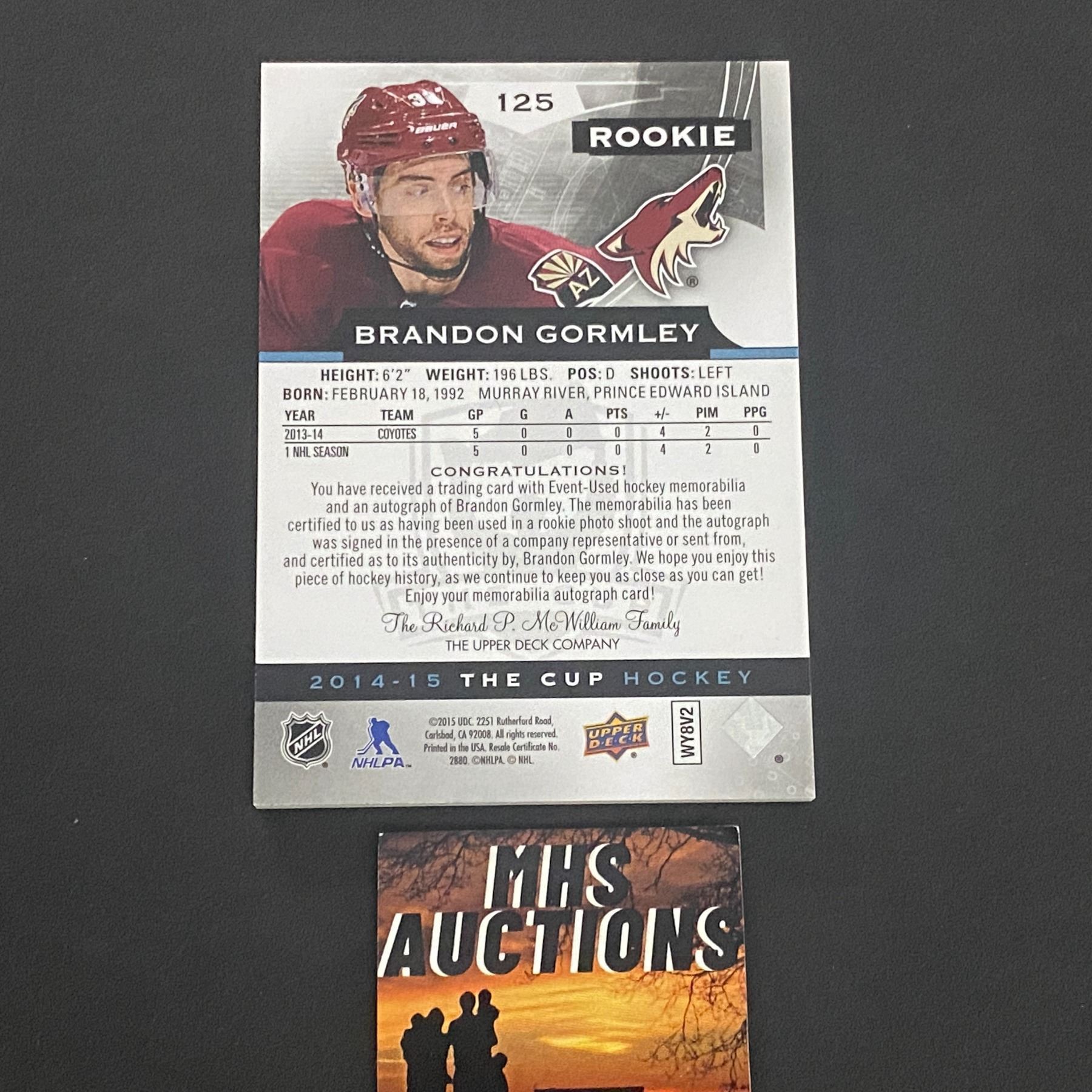 BRANDON GORMLEY 2014/15 THE CUP AUTOGRAPH/PATCH CARD #D/249