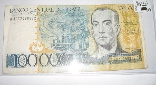 BRASIL 100,000 CEM MIL CRUZEIROS SERIAL # A3073090822A BANK NOTE!! NOTE CAME OUT OF SAFE!! ***Coin, Currency & All Items Listed in this auction - Grades, Conditions and Values are not Safe Deposit Coins LLC Responsibilty. Grades, Condition and Values are determined by Consigner(s) & Buyers ONLY***