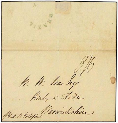 1836 [Jan 11] Entire letter to Henley in Arden from Rio de Janeiro endorsed ´per HMS Goldfinch´ rated ´3s 6d´ due in manuscript with good strike of Falmouth BRAZIL-F fleuron displaying well on reverse. A scarce mark and fine cover.