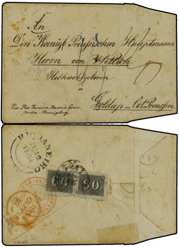 1854 (June 12) Part of cover to Goldapp/Eastern Prussia franked on reverse with horizontal pair of 1850 60r. black pair; sent via British PO in Rio de Janeiro, London with red cds and Aachen (July 16). Faults but rare. Scott 24.