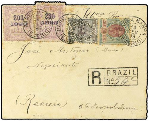 1899 Registered cover to LEOPOLDINA franked by scarce usage of 1894-97 Hermes 1000 r. and 2000 r. with 1898 surcharged in blue 2 x200 r. on 100 r. lilac tied by BARRA MANSA cds´s. TATTY on reverse but countersigned as received. Scarce franking. Scott 122, 124, 137.