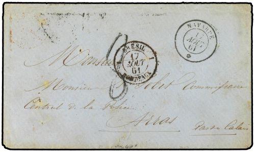 1861 BRASIL a FRANCIA. Sobre con fechador marítimo NAVARRE/* (Salles 1004) y BRESIL/BORDEAUX ambas aplicadas a la llegada.