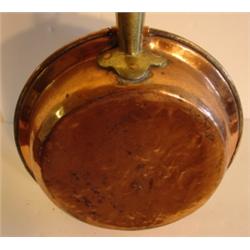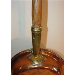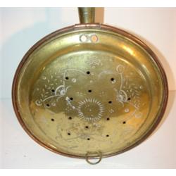 BRASS BED WARMER. Oak handle. Pierced brass lid with copper bottom. 40.5" L