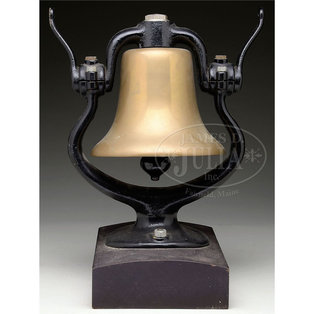 Large brass bell in cast iron harp with two handles mounted to a formed wooden base. SIZE: 17" overall. Bell 8-1/4" dia. CONDITION: Near excellent. 1-13554