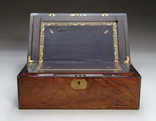 BRASS BOUND ROSEWOOD WRITING BOX. The angled lid folds over to reveal leather gilt decorated writing surface, pen tray and small compartments. Brass line inlay with curved brass edging. Key present. SIZE: 7-1/4in. h x 18in. w x 10in. d. CONDITION: Good. 9-26185