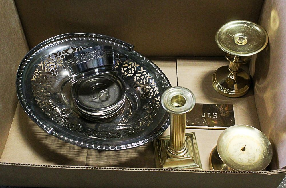 BRASS CANDLE HOLDERS AND SILVER COLOURED BASKETS