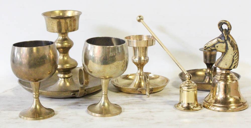 BRASS CANDLESTICKS, GOBLETS, SNUFFER+BELL