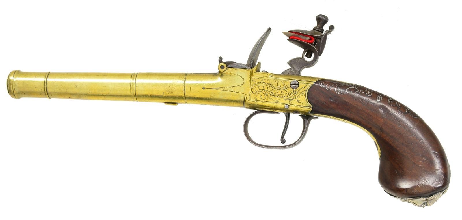 PISTOL BY JOHN BUNNY OF LONDON. Cal. 58. NSN. Bbl. 5 1/8" turned brass, unmarked except for "1" behind wrench lug. Matching number is on brass action & frame which is stamped w/ London black powder proofs & maker's mark "IB" under a crown (John Bunny working in London in the mid 1700s). His name is also engraved in scroll surrounded riband on left side of action & "London" is on right. Iron flintcock is reinforced & frizzen has flush mounted spring. Iron trigger guard slides forward to act as safety. Flared knob grip is of dense European walnut & terminates in unhallmarked silver grotesque mask. Shell pattern chinoiserie decoration is at top of grip. CONDITION: good. Brass cleaned, toning back to a golden hue & has many minor marks and dings. Iron parts are mostly gray patina. Stock has light wear, silver wire is intact. Details of mask are strong. Mechanically good. PROVENANCE: The Estate Collection of Gary Parietti. (01-19255/MGM). ANTIQUE. $1,500-2,500.