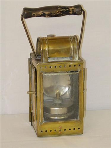 BRASS CARRIAGE LANTERN W/ BAIL HANDLE (10 1/2" TALL TO HANDLE) CLEAR FRONT PANEL W/ RED & GREEN SIDE PANELS- MARKED D B W/ ORIGINAL BURNER & REFLECTOR - WEAR & IMPERFECTIONS