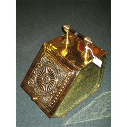 LOVELY ENGLISH BRASS COALBOX WITH EMBOSSED DECORATION TO THE HINGED FRONT LID, WHICH OPENS TO REVEAL THE ORIGINAL TIN LINER. THE COALBOX HAS AN EBONISED WOODEN HANDLE FOR EASY CARRYING AND RESTS ON ROUND BRASS BUN FEET. IT HAS A SLOT ON THE BACK WHERE A SMALL SHOVEL WOULD ONCE HAVE BEEN - UNFORTUNATELY THIS IS MISSING WHICH IS USUALLY THE CASE. IT IS IN VERY GOOD CONDITION AND HAS BEEN PROFFESSIONALLY POLISHED. A GREAT DECORATIVE AND USEFUL ACCESSORY FOR THE FIREPLACE!