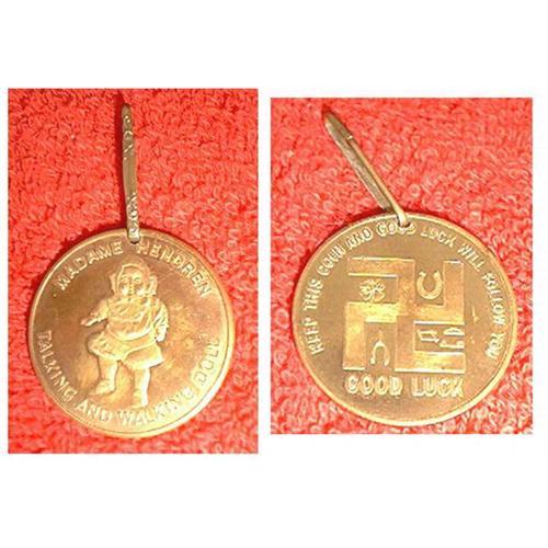 This is a 1 1/4" brass doll coin tag that would have come attached to the doll when new. It is for Georgene Averill's Madame Hendren talking and walking doll and is in excellent condition. I believe this is a scarce item and would add more to your doll's value than the price I am asking. The front has an embossed picture of the doll along with "Madame Hendren Talking and Walking Doll". The back has good luck charms and says "Keep This Coin and good luck will follow you, Good Luck".