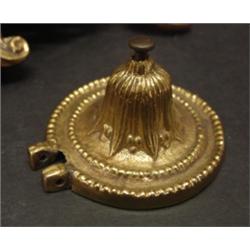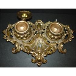 BRASS DOUBLE INKWELL. Consists of two inkwells with stand. One lid on inkwell is missing hinge. Metalware inserts in both inkwells. 12.5" W