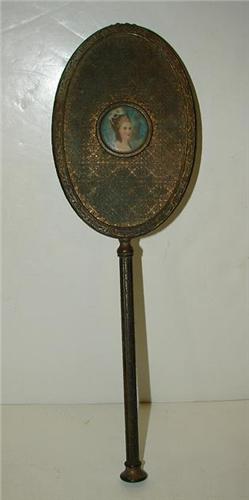 BRASS DRESSER MIRROR. Decorated on reverse with miniature portrait of 18th century French female. Shows signs of varnishing throughout. 13” L