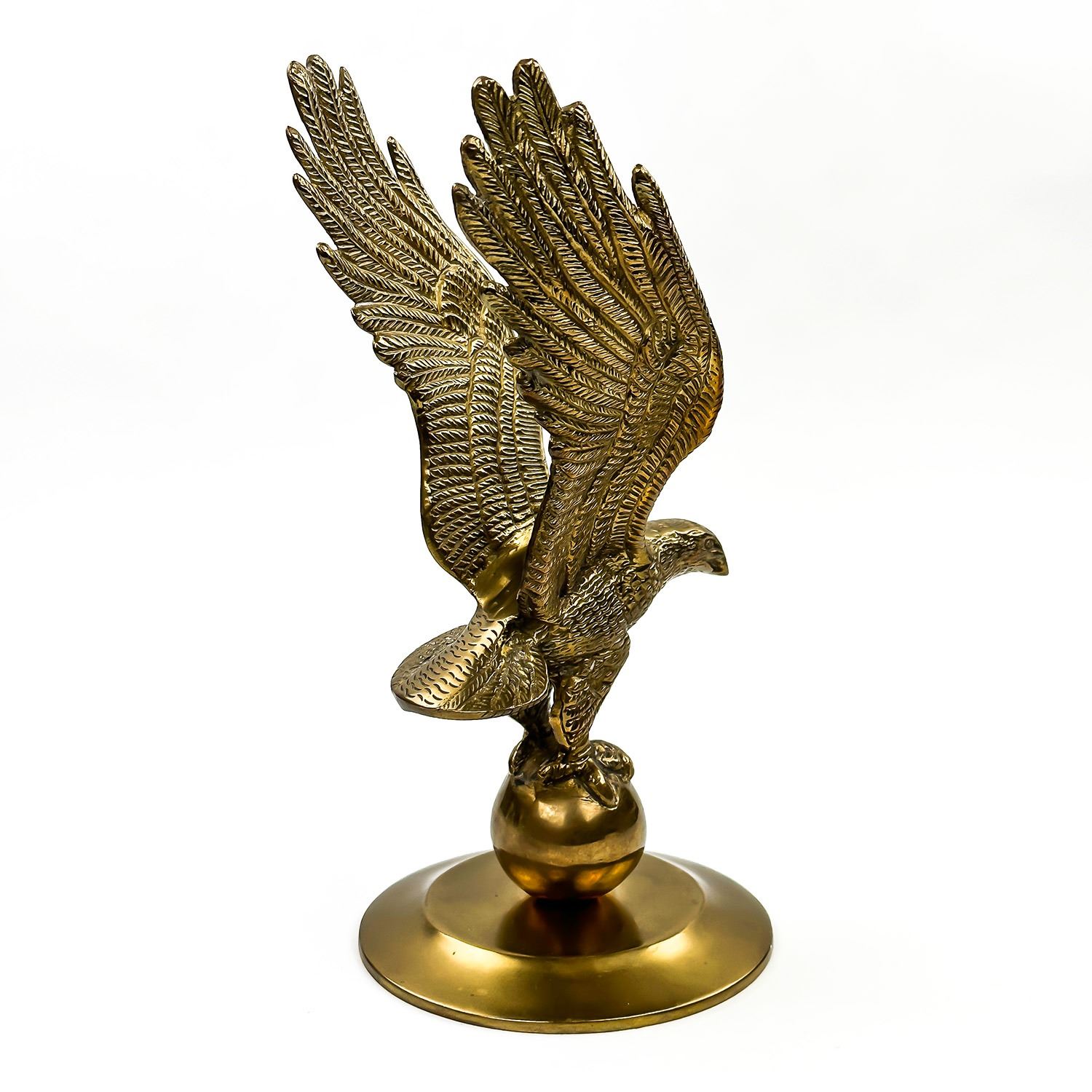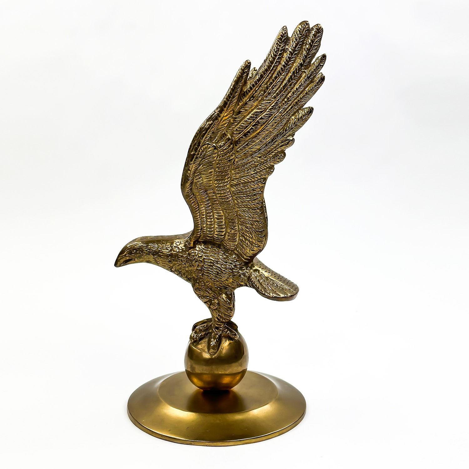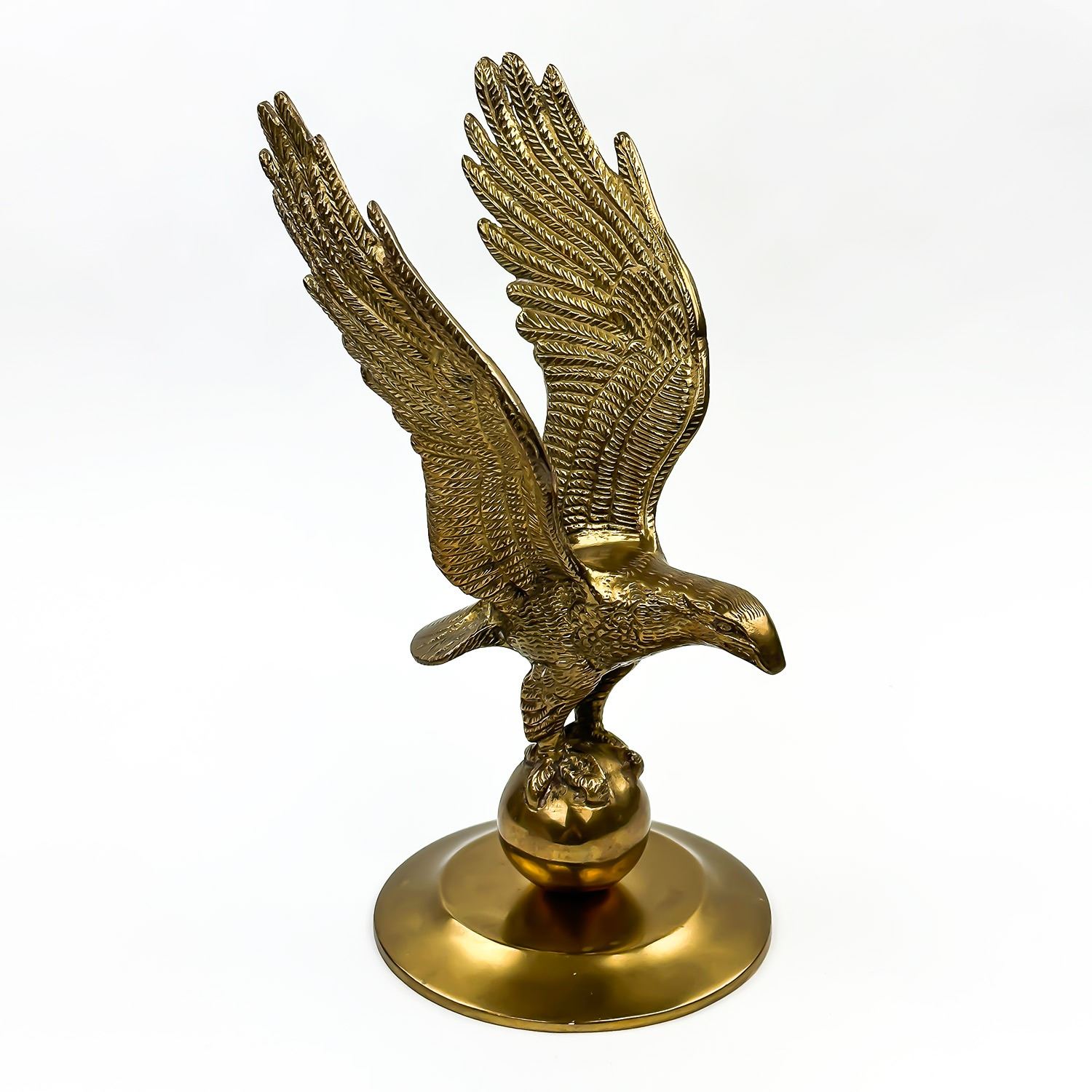 #8571 - LARGE BRASS EAGLE STANDING ON A BALL OR GLOBE. MEASURES: 11” (28 CM) TALL BY 5.25” (13.5 CM) WIDE - HEAD TO TAIL - 4.75” (12 CM) DISTANCE BETWEEN WINGS***ITEM(S) LOCATED IN LETHBRIDGE ALBERTA. FREE TRANSPORT TO EDMONTON OFFICE AVAILABLE FOR THIS AUCTION. WORLDWIDE SHIPPING IS AVAILABLE FOR ALL ITEMS