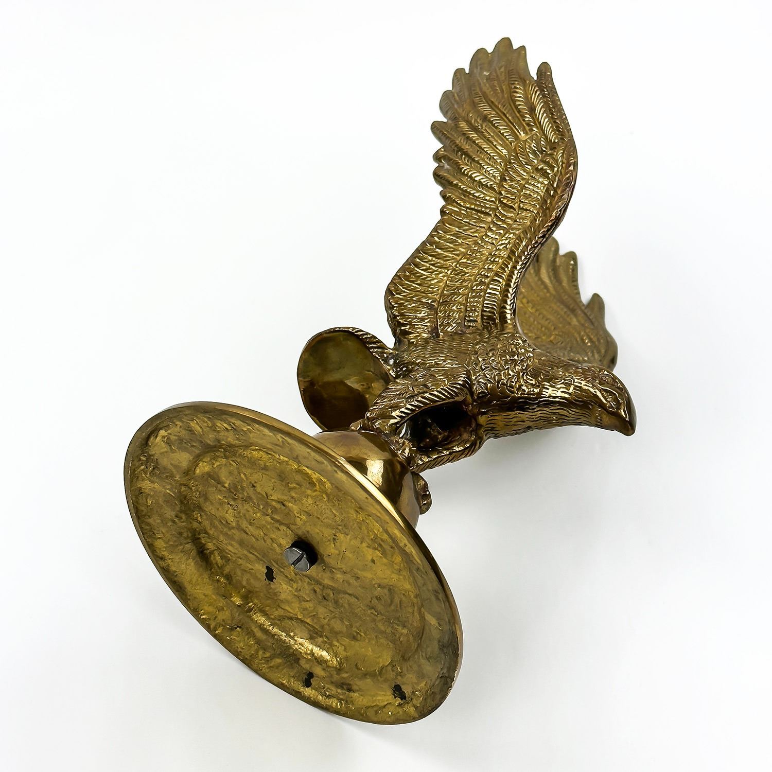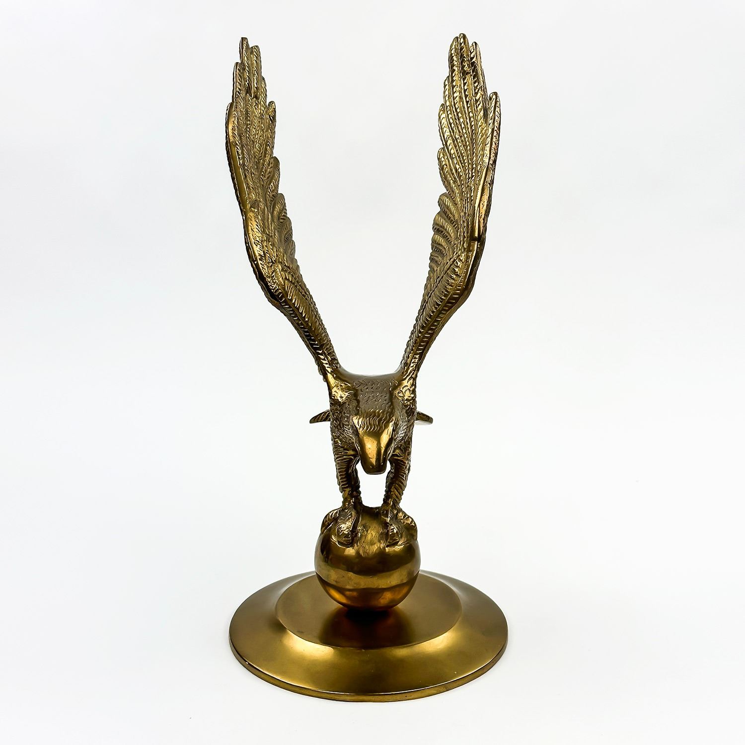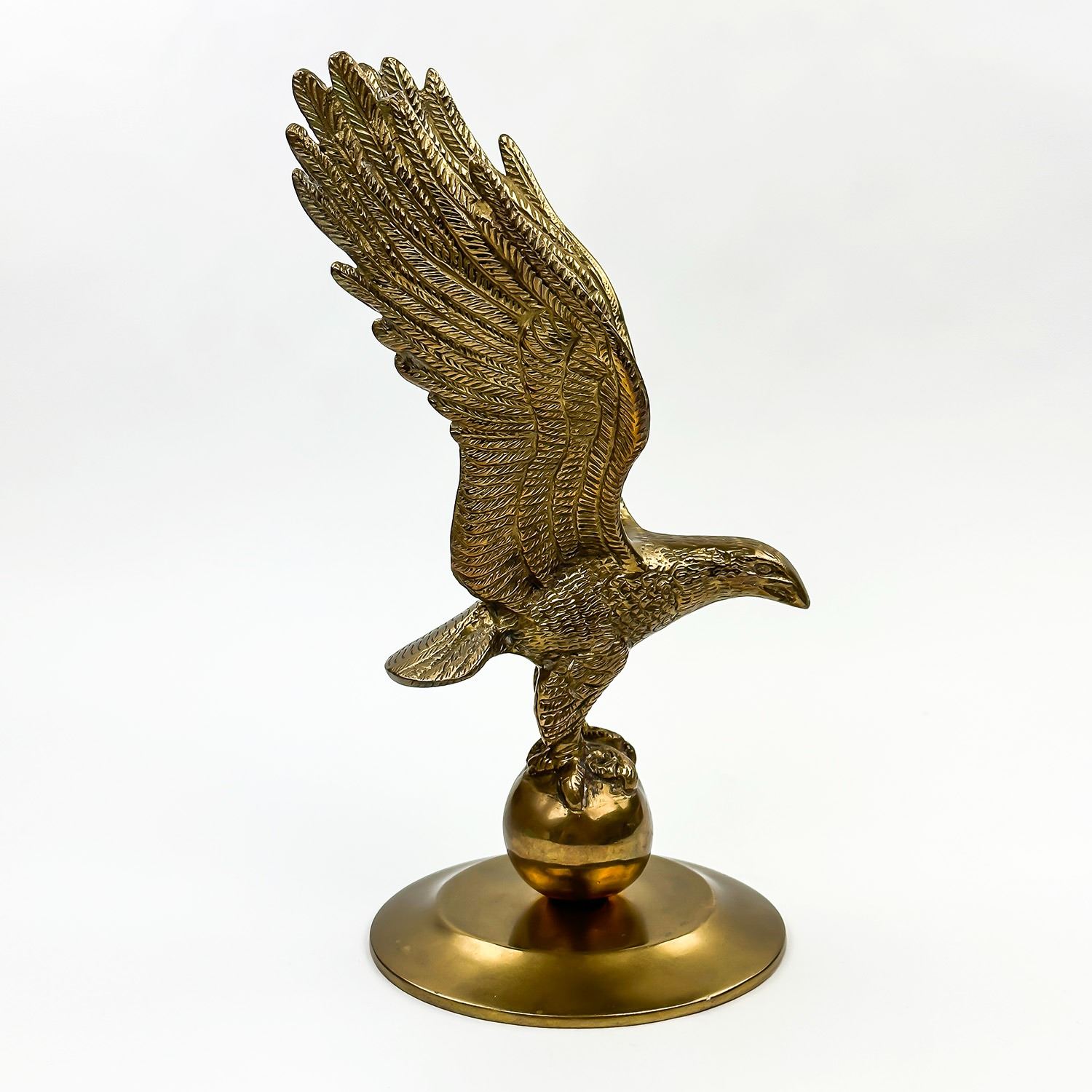 #8571 - LARGE BRASS EAGLE STANDING ON A BALL OR GLOBE. MEASURES: 11” (28 CM) TALL BY 5.25” (13.5 CM) WIDE - HEAD TO TAIL - 4.75” (12 CM) DISTANCE BETWEEN WINGS***ITEM(S) LOCATED IN LETHBRIDGE ALBERTA. FREE TRANSPORT TO EDMONTON OFFICE AVAILABLE FOR THIS AUCTION. WORLDWIDE SHIPPING IS AVAILABLE FOR ALL ITEMS