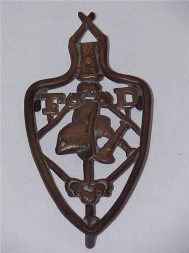 BRASS FIREMANS TRIVET W/ F.D. CROSS TRUMPETS, FIR