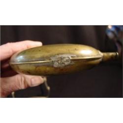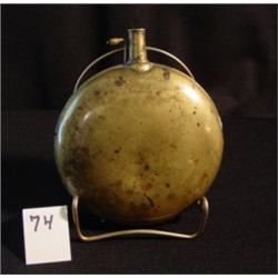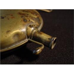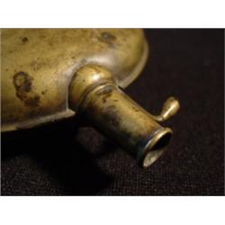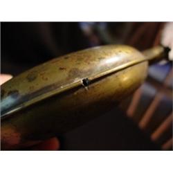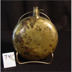 5 1/4" diameter W 7/8" neck 1/4" opening, Brass flask with narrow neck, old repair on seam, no marks and 1 side has dent.
