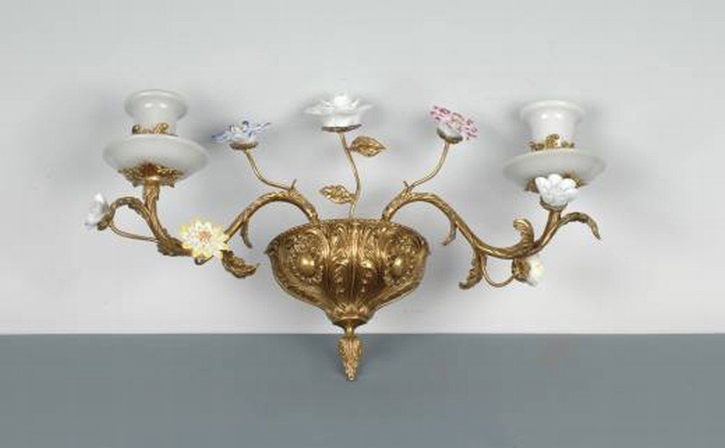 BRASS FLORAL WALL MOUNT CANDLEHOLDER - BRASS BASE AND STEMS - HAND PAINTED PORCELAIN FLOWERS - PORCELAIN CANDLEHOLDERS - 15.6L" x 8.9W" x 5.7H"