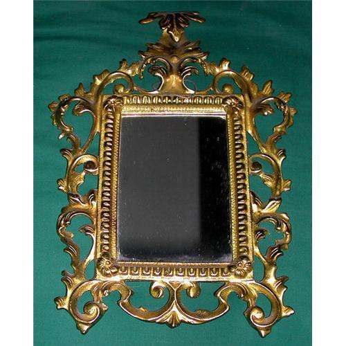 AN ATTRACTIVE SOLID BRASS FLORENTINE OR NEAPOLITAN-STYLE MIRROR__<P>Approximately 12" in height and 8.5" in width, this charming mirror, modeled after the carved Italian wood mirrors of the same type, can hang on the wall of a bathroom, hallway, or bedroom, and lend a different and unique appeal to the space. It appears to have been made sometime in the 20th century.
