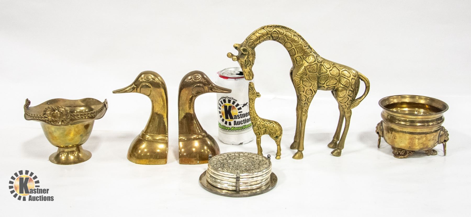 BRASS GIRAFFE AND BABY, DUCK BOOKENDS AND MORE