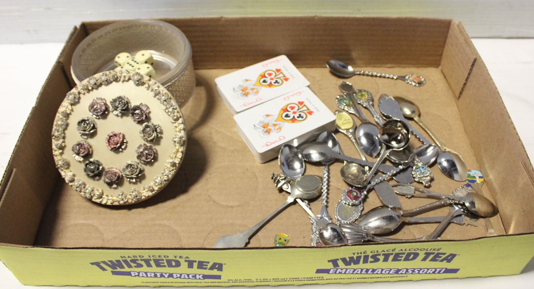 SEALED OLD DECKS OF CARDS + DICE SOLD WITH VARIOUS COLLECTORS SPOONS FROM ALL DIFFERENT COUNTRIES **ALL ITEMS MUST BE REMOVED BY 5PM SATURDAY, FEBRUARY 1ST 2025. ALL REMAINING ITEMS WILL BE SUBJECT TO A $6.00 PER DAY STORAGE CHARGE. ANY ITEMS REMAINING AFTER MONDAY, FEBRUARY 24TH 2025 WILL BE CONSIDERED FORFEITED. NO REFUNDS WILL BE ISSUED FOR FORFEITED ITEMS. TO SCHEDULE A PICK UP APPOINTMENT CLICK HERE