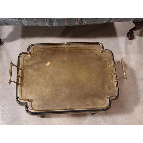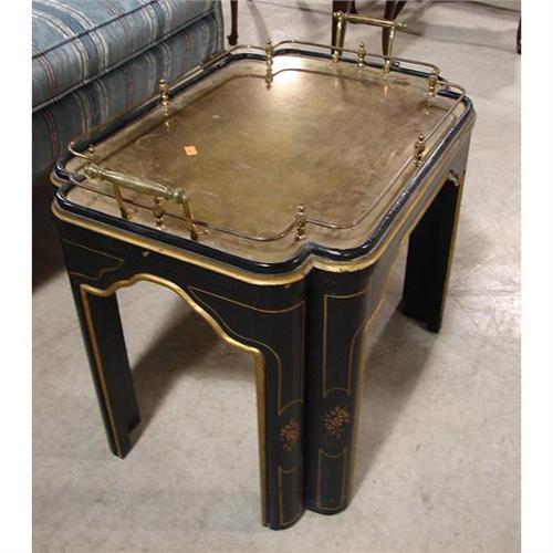 BRASS & LAQUERED ORIENTAL COFFEE TABLE. Has gilt trim with floral design at legs with handles at sides and gallery at top. 20.5” H, 23.5” L, 17.5” W