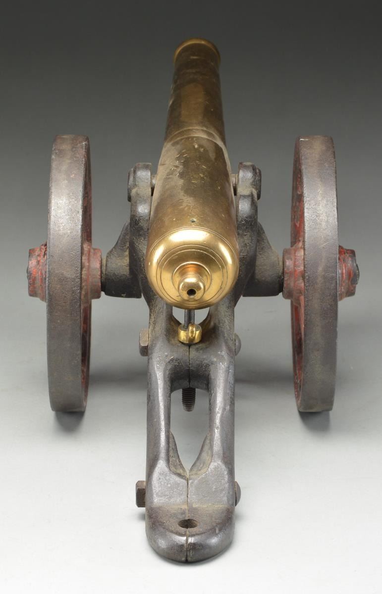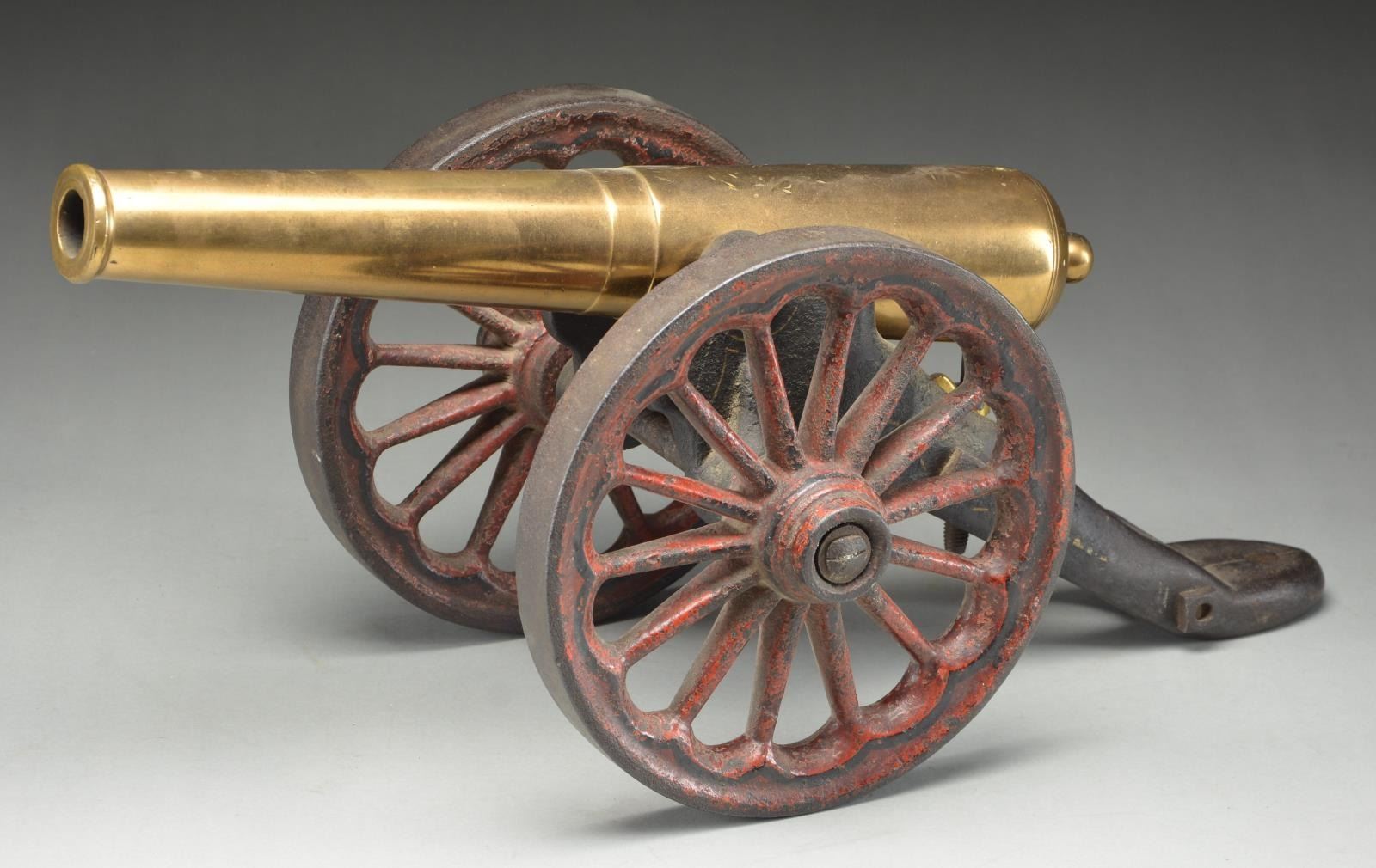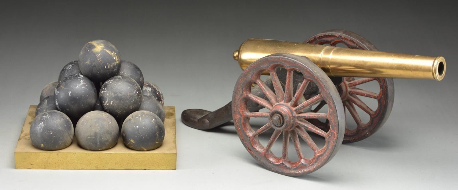 CANNON BALLS. Unmarked brass signal cannon measuring 18" in length and 4 1/2" at the trunnions. 1" bore. 2 piece iron carriage with iron wheels. UNATTACHED ACCESSORIES: 14 decorative cannon balls. CONDITION: Cannon exhibits scattered marks and dings from storage and handling, but is otherwise fine. Iron carriage retains a dark gray appearance. Decorative cannon balls show some flaking and minor wear, but otherwise present nicely. PROVENANCE: From the Lifelong Collection of Glen E. Mattox. (02-18944/MLW). $400-600.