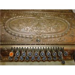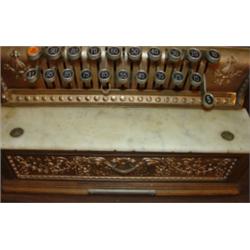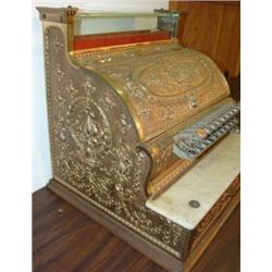 Brass National cash register. Metal nameplate near bottom. Serial # 935382, 333 on plate. Has marble rest near bottom. 17" H, 16.25" W, 16" D