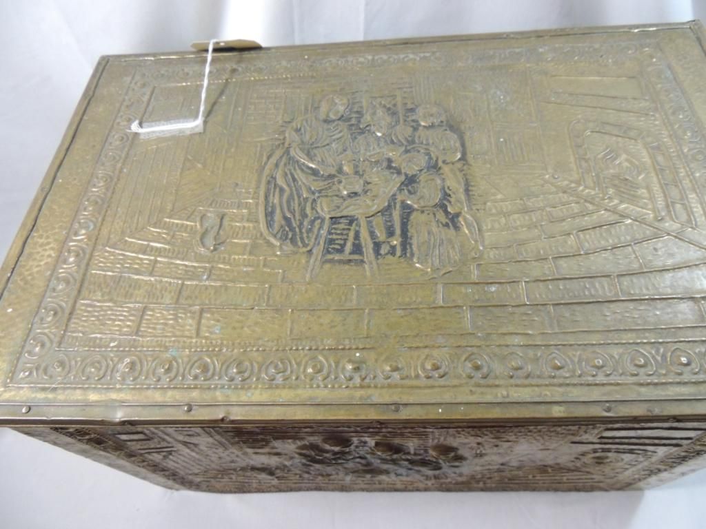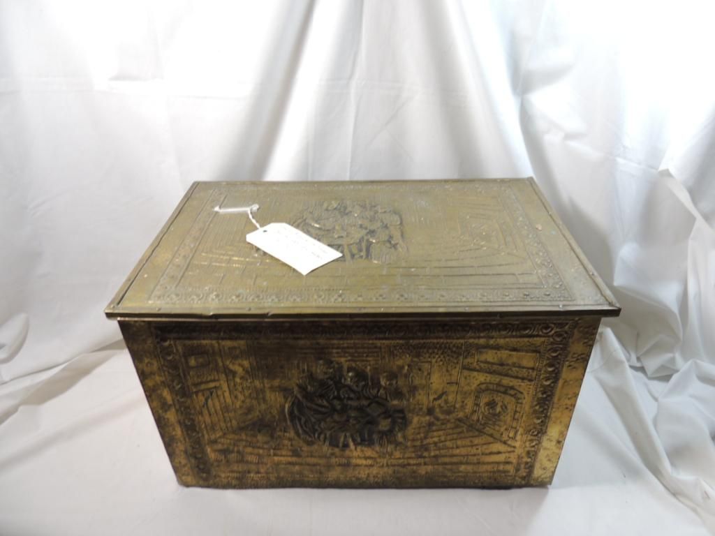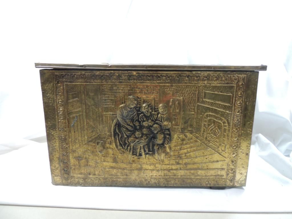 LARGE TIMBER BOX. FOR KEEPING FIRE STARTERS OR OTHER STORAGE. EMBOSSED BRASS AND HAMMERED COPPER. AS SHOWN SEE PHOTO FOR MORE DETAILS.