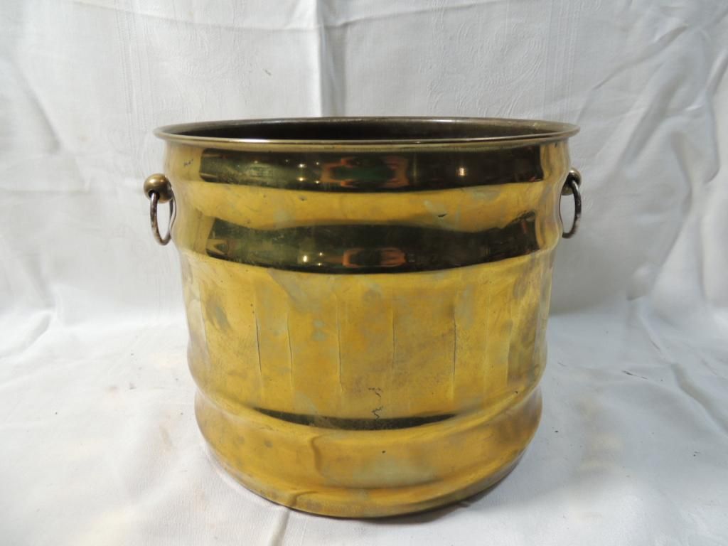 BRASS PLANTER POT WITH BAIL HANDLES. 7 1/2" TALL SIMPLE DESIGN. AS SHOWN. SEE PHOTO FOR MORE DETAILS.