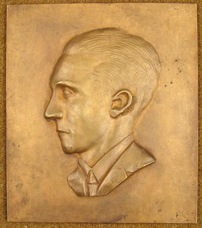 OFFERED HERE IS AN OUTSTANDING & VERY RARE BRASS PLAQUE OF JOSEF GOEBBELS. JOSEF WAS HITLER'S PROPAGANDA MINISTER AND AUTHOR OF "TRIUMPH OF THE WILL". GOEBBELS IS RARELY DEPICTED IN AN ARTISTIC RENDERING OF THE PERIOD. THE DIMENSIONS ARE 4 3/4" X 5 1/2", WITH HANGING ROD IN BACK. IT WAS SIGNED BY THE ARTIST, F.G. IN THE LOWER RIGHT. THE PLAQUE IS ONE OF A SET OF 3 UP FOR AUCTION. *