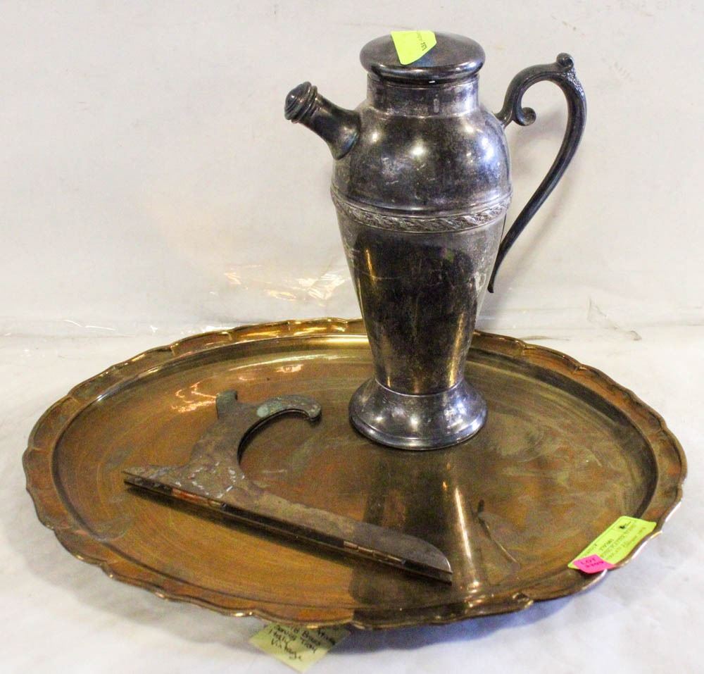 BRASS SERVING PLATTER, STAND AND SILVERPLATE JUG