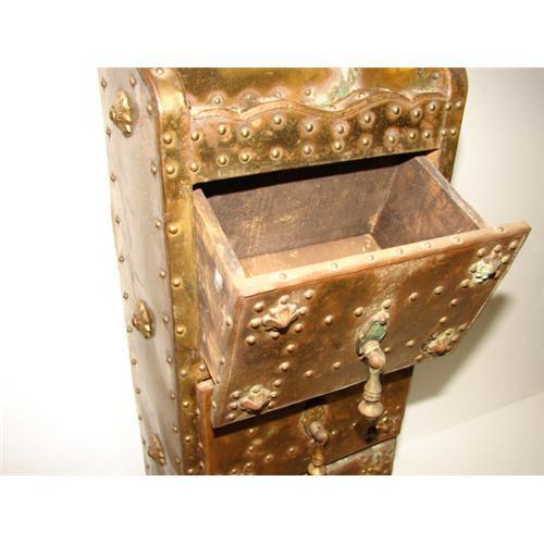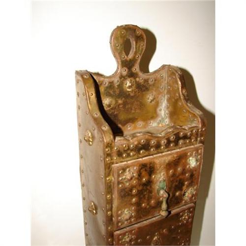 EARLY WOODEN & BRASS COVERED HANGING SPICE BOX. Has four drawers. Shows tarnishing to the brass. 24.5" H