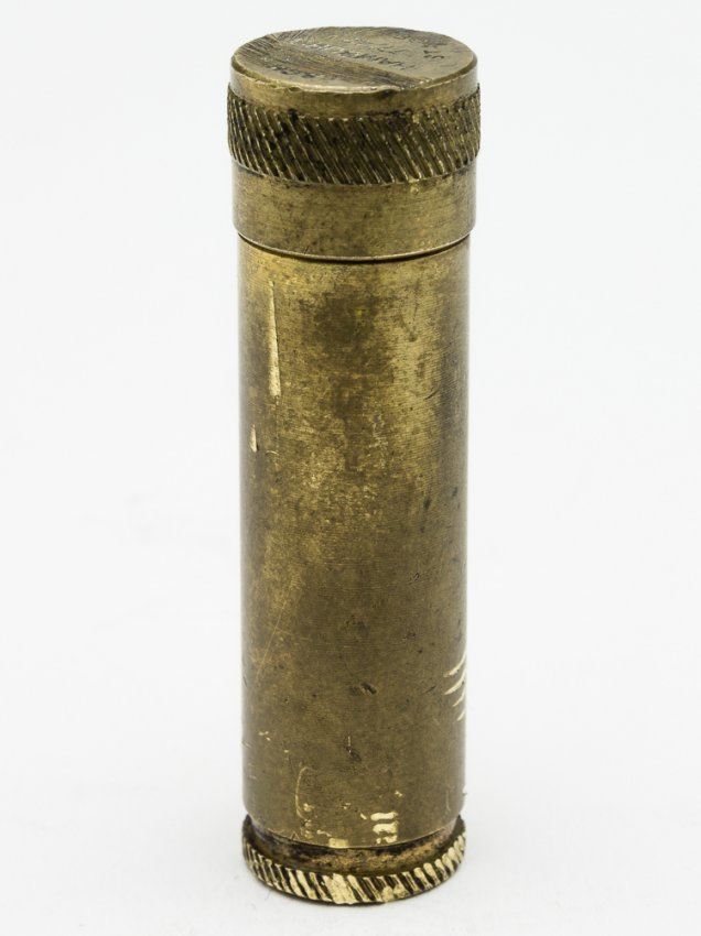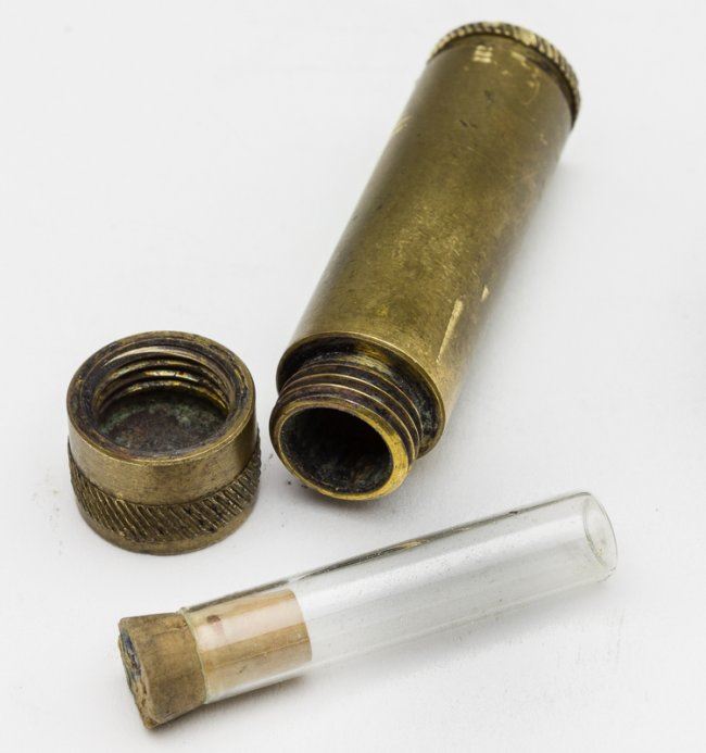 SS contract 77/42 Tesch und Stabenow hollow brass container for a cyanide vial, 1 3/4" long, 5/16" wide. These containers held glass, single-dose capsules of cyanide which would be removed by the bearer prior to questioning. He would bite down on the glass ampule and the cyanide would take its deadly effect within seconds. This poison was effectively used by both Heinrich Himmler and Herman Goring to escape execution at the hands of the Allies. The vial bears the correct type knurled edges on both the lid and the bottom. The SS runes usually seen on the top have been filed-off, perhaps by a restricted European dealer or owner. Additionally, although these vials have been widely reproduced, our example does not bear the SS runes on the bottom cap, but instead is engraved: "C 1S". The filing and atypical lettering compared to the reproductions leads us to believe that this is legitimate, period piece. A very thin-walled glass ampule (empty) with cork is set within. A few scuffs to the knurled rim from prior opening, else very good. Provenance: The War Museum, New York.