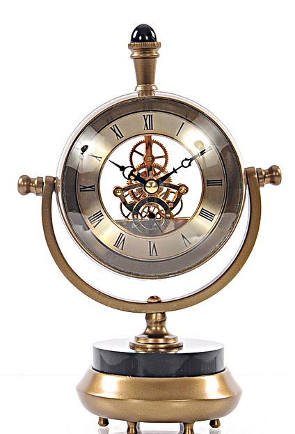 BRASS TABLE CLOCK **|**|** This 19th century inspired table clock puts time into perspective, as you get to observe how the clock ticks with the clear inner faceplate. The brass and aluminum body along with the roman numeral clock numbers give the home or office a nostalgic feel. • Made out of brass with a bright annealed finish • Clock uses one AA 1.5V battery (battery not included)