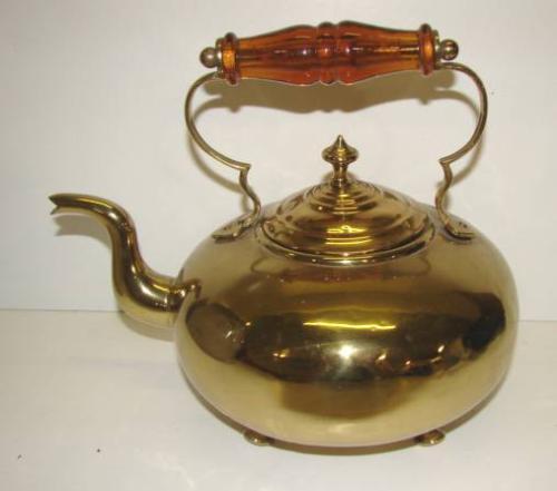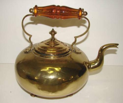 BRASS TEA KETTLE. Has amber glass grip at handle. Kettle has four brass feet. Marked on bottom "J.C/B" at bottom with arrows. Kettle shows minor dents to brass throughout. 8.5" H to top of handle.