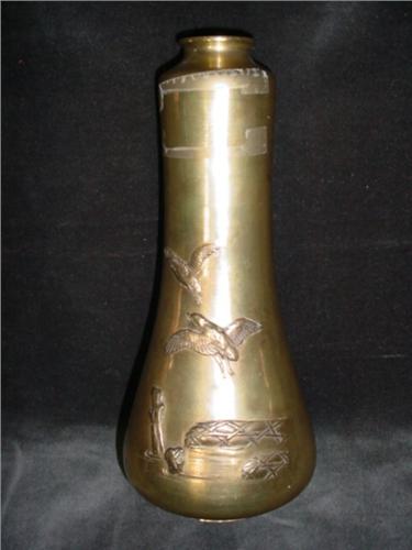 BRASS VASE WITH BIRD DÉCOR CIRCA 1927 10 INCHES, NO MAKERS MARK.