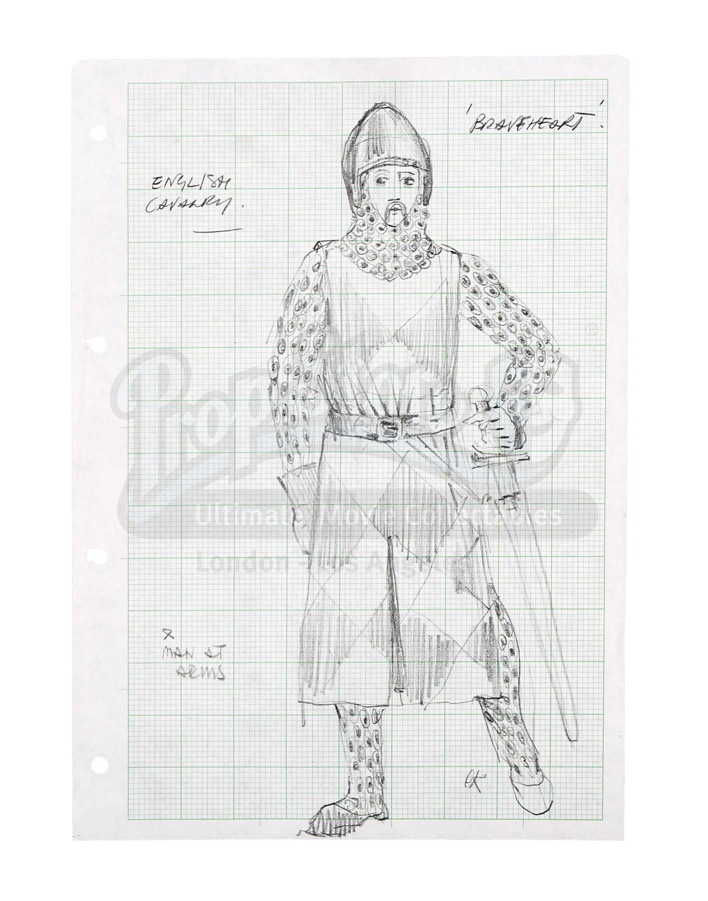 Four original pencil costume designs by BAFTA-winning costume designer Charles Knode from Mel Gibson's historical drama Braveheart. These hand-drawn designs show Princess Isabella (Sophie Marceau), along with an English soldier, an English cavalryman, and a peasant.
