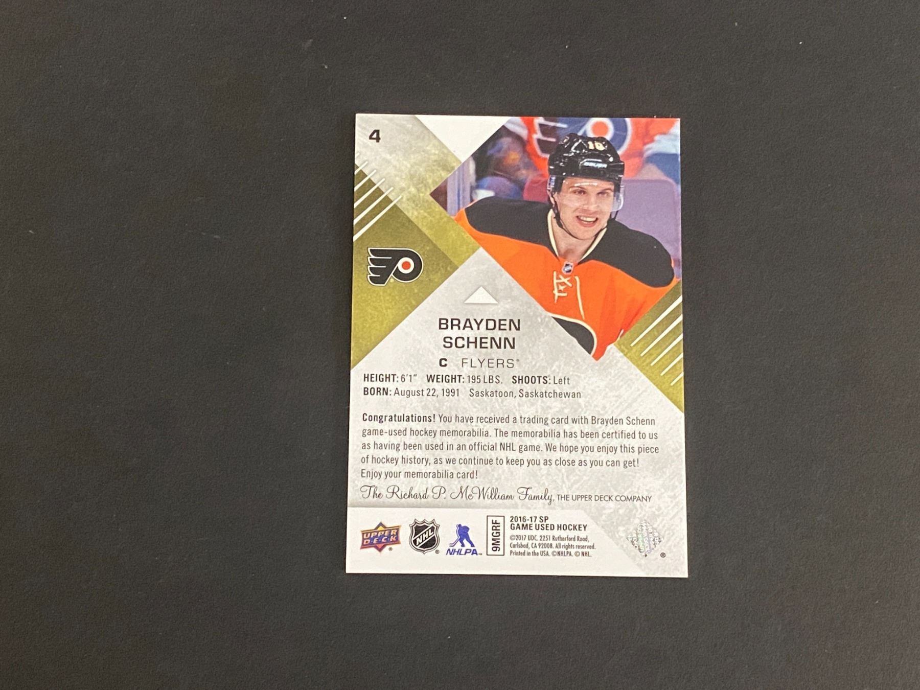 BRAYDEN SCHENN PHILADELPHIA FLYERS JERSEY CARD