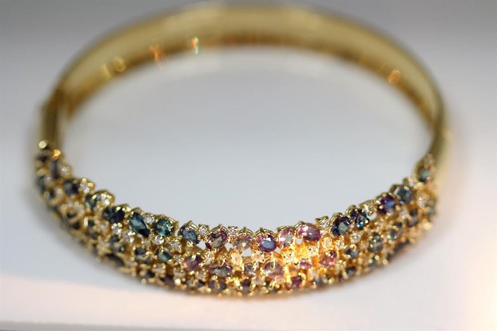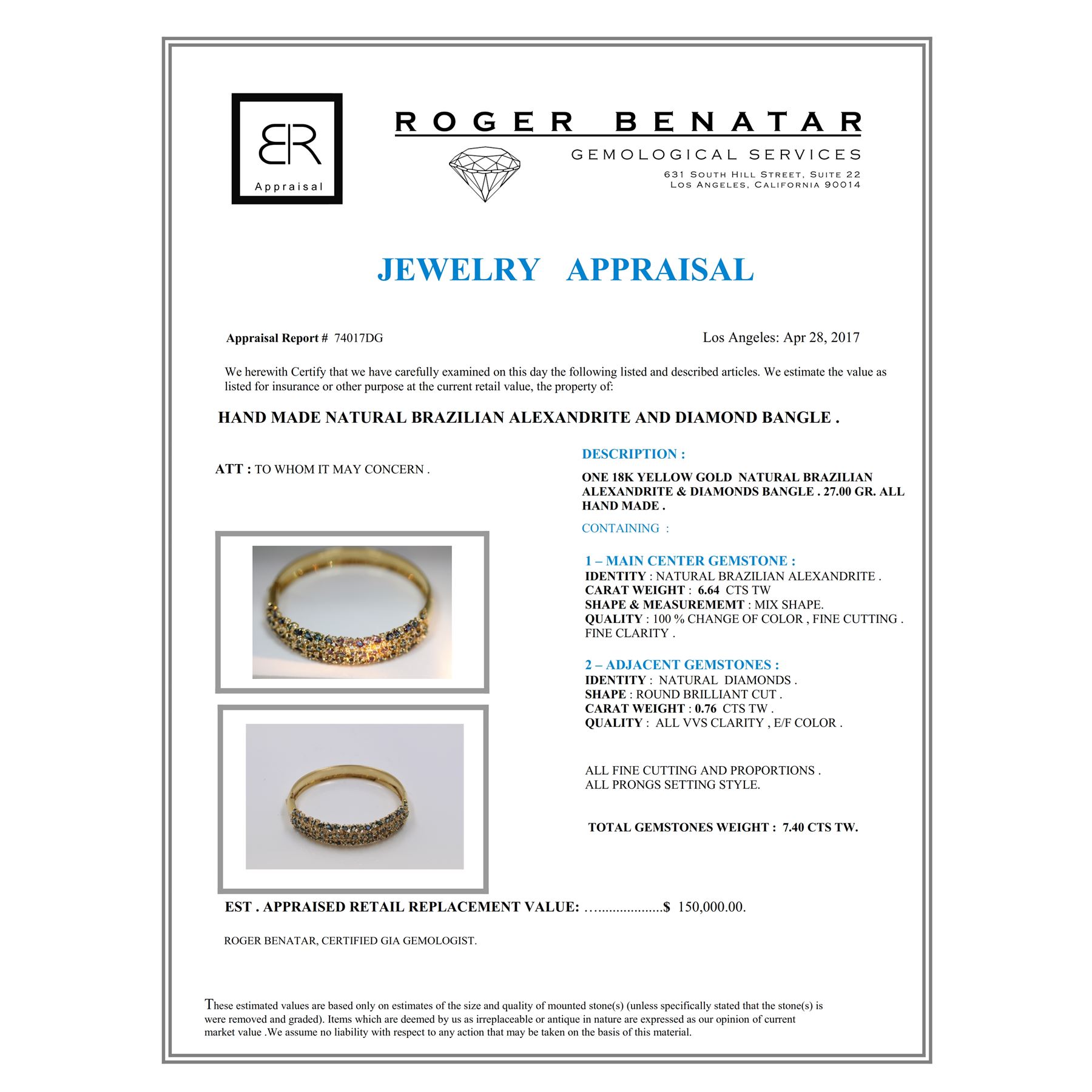 BRAZIL ALEXANDRITE 6.64CT 18K YELLOW GOLD BANGLE/0.29CT NATURAL ALEXANDRITE 14K WHITE GOLD RING /3.92CT NATURAL COLOMBIAN EMERALD 14K WHITE GOLD RING /1.26CT NATURAL DIAMOND 14K WHITE GOLD RING /#GVB1619