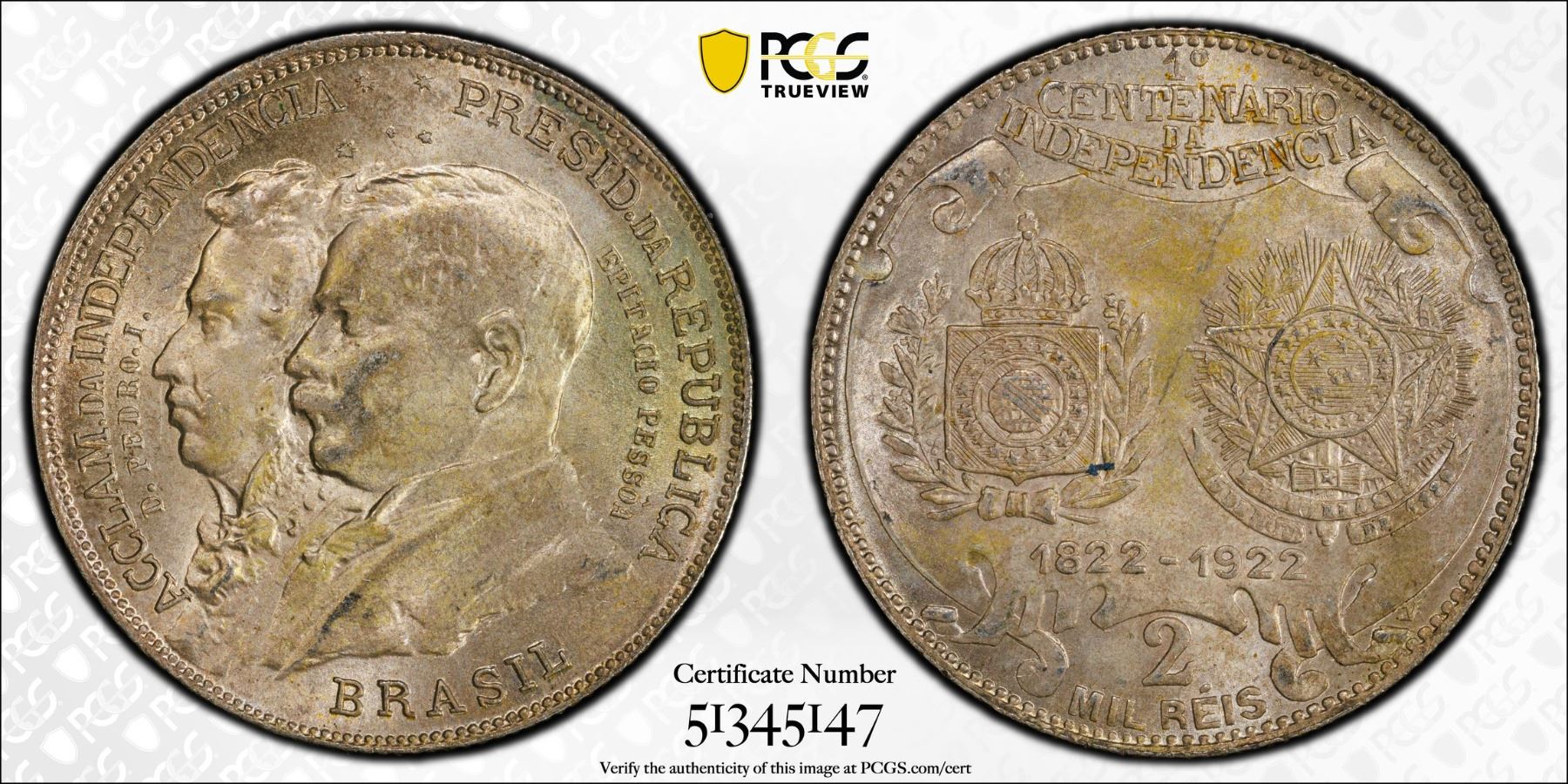 BRAZIL: Republic, AR 2000 reis, 1922, KM-523a, Mald-640.02, Independence Centennial, PCGS graded MS64.