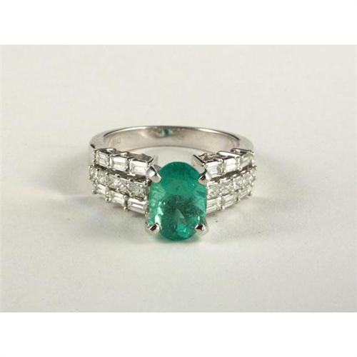 RING: Firey 14k white gold lady's ring set with a medium green Brazilian emerald and round and princess cut diamonds on the band. The pear shaped emerald measures approximately 3.24 cts and is semi-translucent. The diamonds measure approximately 0.31 ctw, have VS1 to VS2 clarity and H color. Appraisal included.