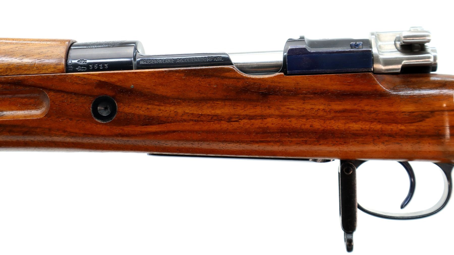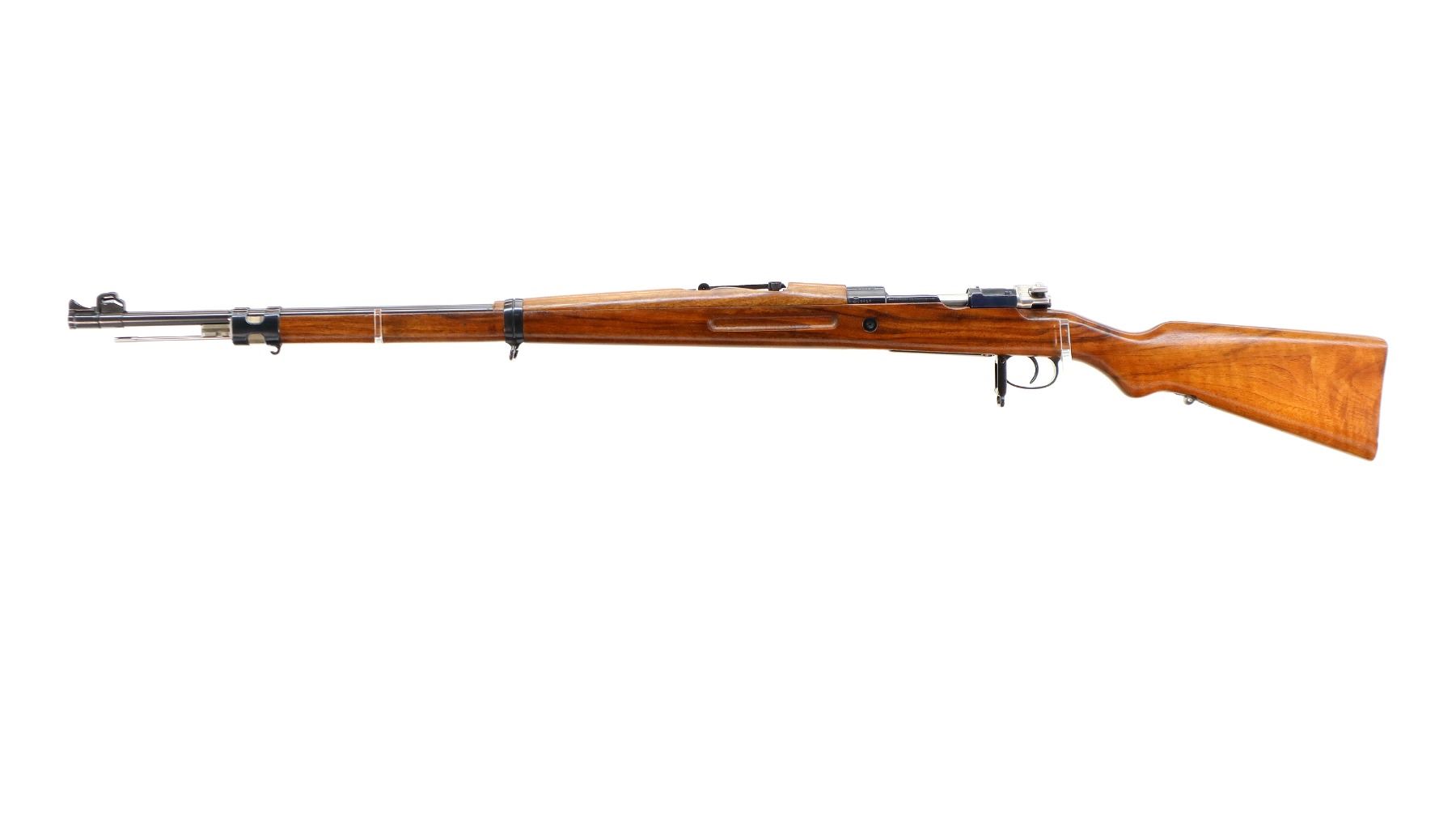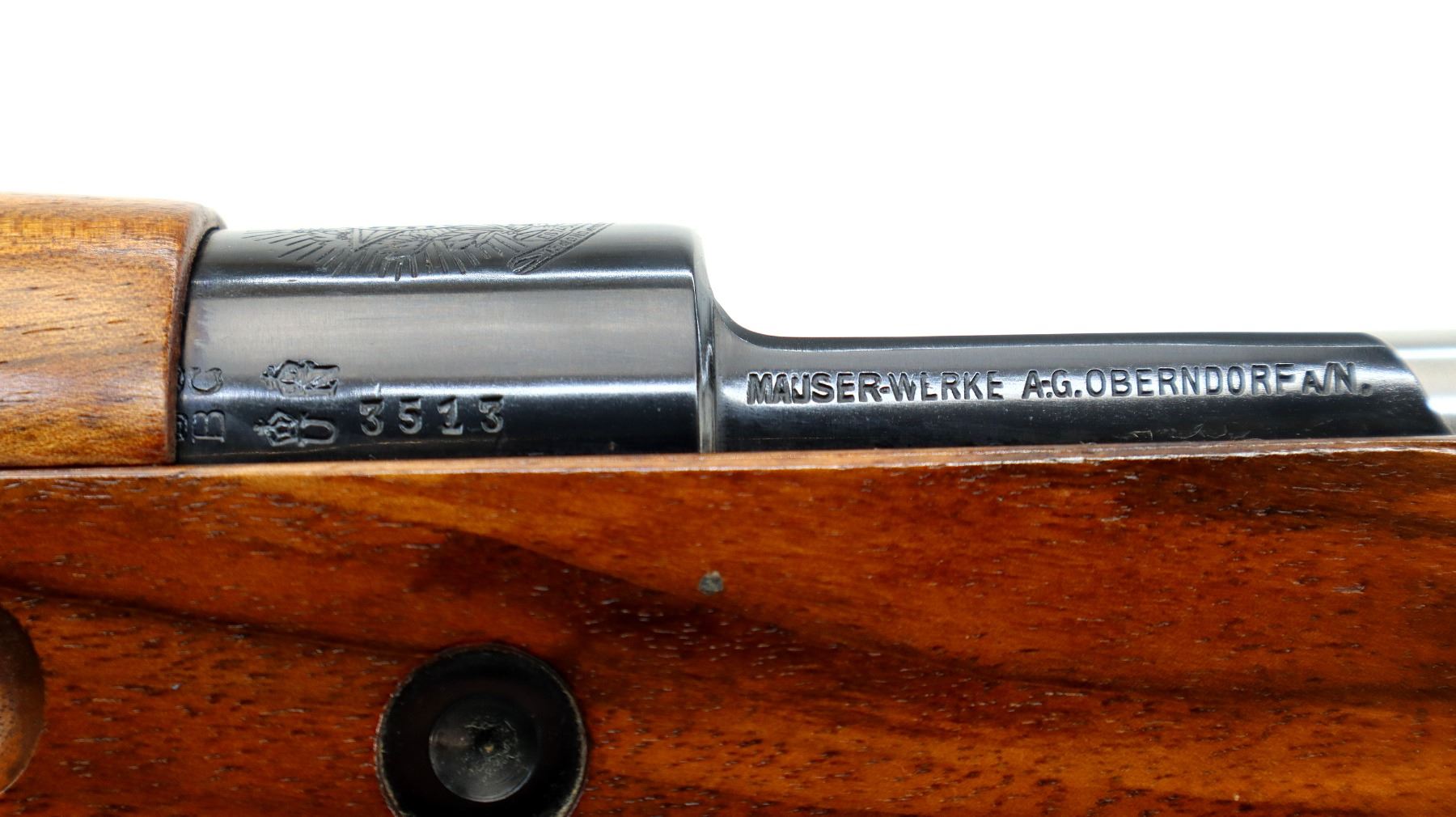 Main Description: Manufactured by Mauser Oberndorf, visible serial numbers match. Barley corn front sight with ramp, adjustable u notched rear sight, polished blued finish, Brazilian crest on receiver ring, Mauser Banner on rear bridge, silver bolt with straight handle. Two piece full military wood stocks, finger grooved forearm, pistol grip, smooth steel butt plate, unmarked steel stock disk, sling swivels, bayonet lug, cleaning rod.
